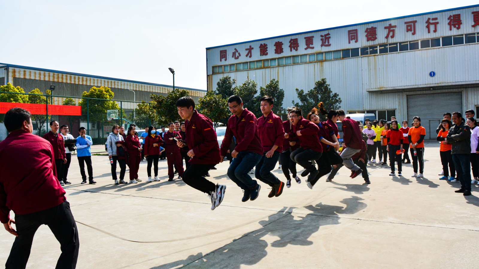在隨后的比賽中,“拔河比賽”經過三輪角逐,第一名被商貿酒廠聯隊拿下,這第一名少不了喉嚨嘶啞的啦啦隊的一份功勞。“動力火車”在“互抱小腿”的“艱難”賽程中進行,幾圈下來集團后勤及汽貿聯隊跑的更快。“跳大繩”環節到了,熱力市政聯隊表示一口氣跳三十下都不喘氣兒的,項目第一名拿的穩穩當當。運動會現場,助威一浪接著一浪,歡笑聲、吶喊聲也是此起彼伏,好不熱鬧。