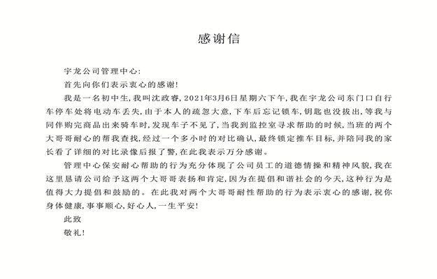 3月23日上午,宇龍廣場物業(yè)部安保科同事收到了一封感謝信,信中對宇龍廣場安保科朱笑葛、王帥兩位同事表示了真摯感謝,感謝他們在顧客丟失電動車后所提供的熱情耐心的服務(wù)。雖然這封感謝信只有短短幾行字,但字里行間無不透露著顧客對我們宇龍廣場工作人員服務(wù)的認(rèn)可。