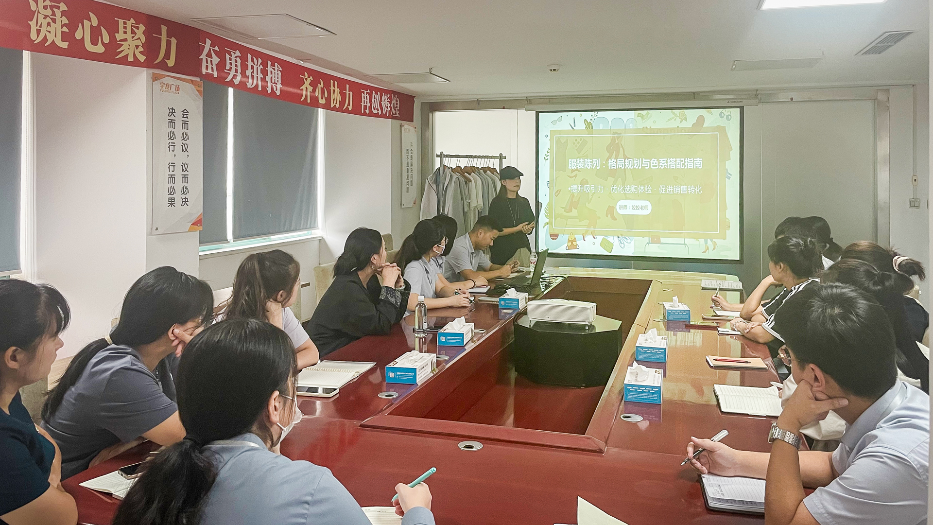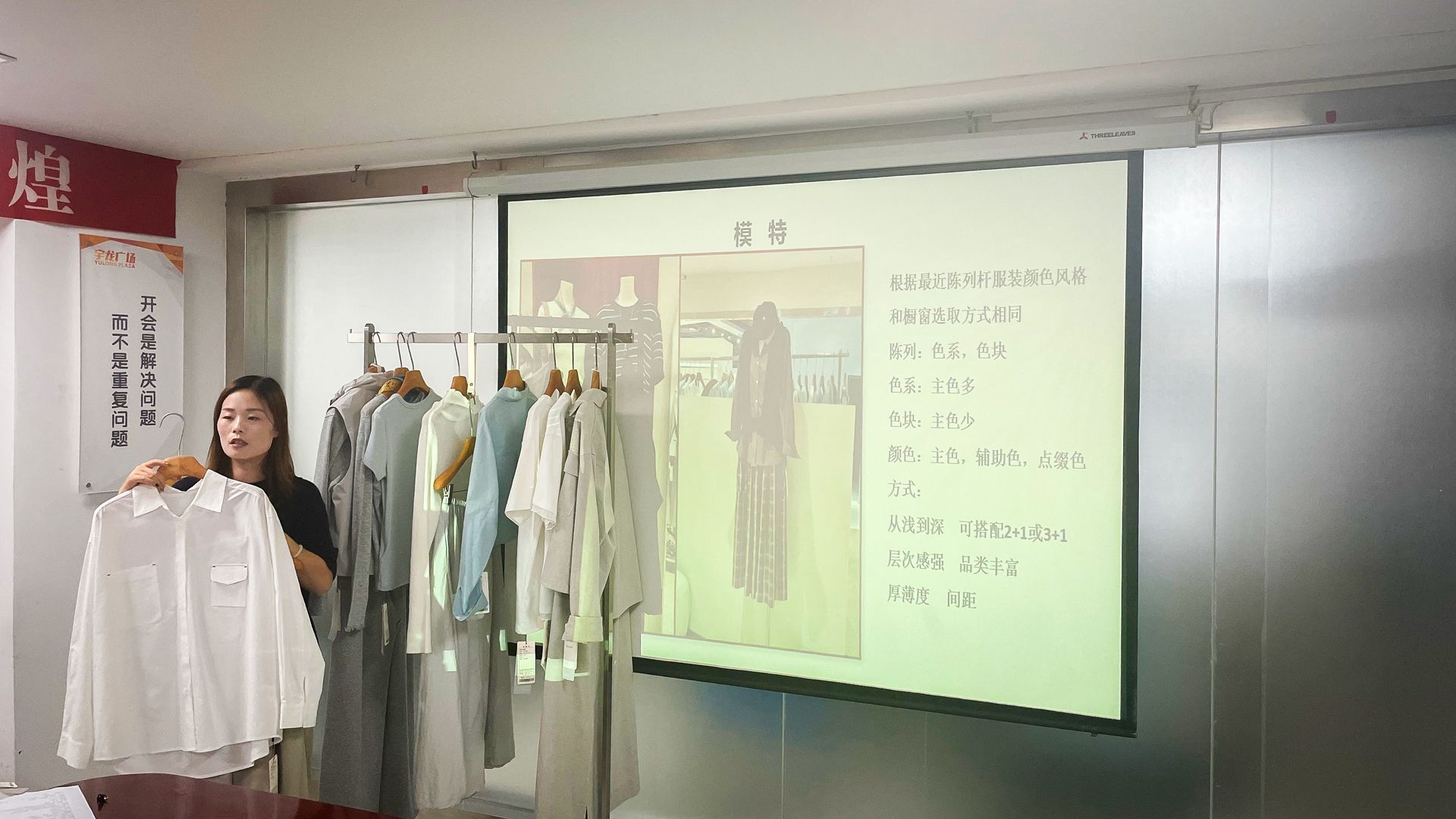 分享會聚焦陳列格局策略與色系系統規劃,深入解析櫥窗陳列如何結合天氣變化、實穿潮流與庫存調控,明確賣場A、B、C區分別承擔引流、新品展示和歸類陳列職能,并強調區域陳列風格應與模特展示相統一,通過科學配色提升整體視覺層次。隨后現場借助真實服裝道具開展實搭演練,強化參會者對色彩搭配、動線設計與視覺營銷的實際應用能力,助力通過優化陳列布局提升店鋪形象、引導顧客動線,進而提高試穿率與連帶銷售。